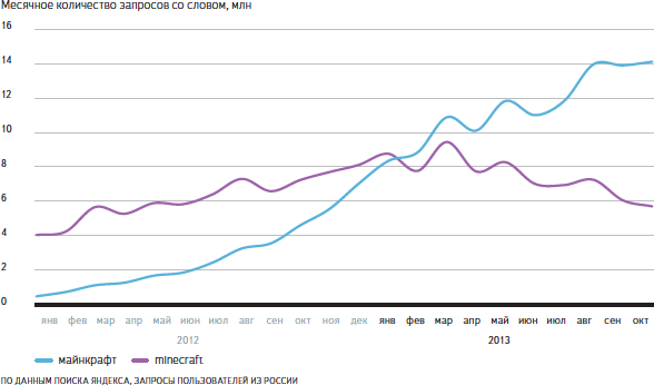 Главное слово 2013 года по версии «Яндекса» – название игровой вселенной «Майнкрафт», причём именно на русском языке. За первые десять месяцев количество запросов с данным словом выросло почти вдвое. Это рекордный результат, если учесть, что число росло не от нуля, а от внушительной цифры в 8 миллионов запросов в месяц.