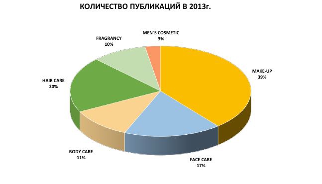 Make-up с 2009 года занимает первое место по общему количеству публикаций. В 2013 году его доля выросла с 34% до 39%. Второе место впервые захватила категория Hair care: на долю средств по уходу за волосами приходится 20% общего числа публикаций. На третьем месте с небольшим отрывом (17%) находится категория Face care — средства по уходу за лицом. На Body care (Средства по уходу за телом) приходится 11% публикаций, на Fragrancy (Парфюмерия) — 10%, на Men's cosmetic (Мужская косметика) — 3%.