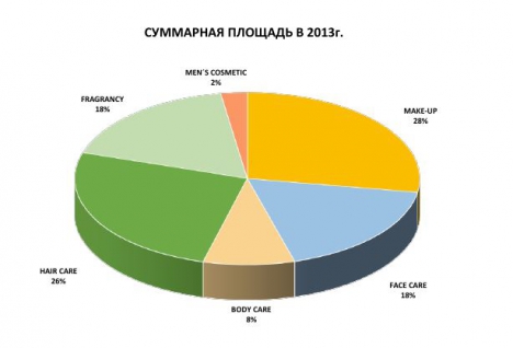 Лидером по суммарной площади публикаций также является категория Make-up. Впрочем, ее отрыв от второго места Hair care значительно сократился. Если по итогам 2012 года он составлял 7%, то по итогам 2013 разница сократилась до 2%: лидерские 28% (1874 полосы) против 26% (1747 полос). За ними следуют категории Face care и Fragrancy, на оба сегмента приходится по 18%. Что касается Body care и Men´s cosmetic, то их доли по сравнению с 2012 годом незначительно упали: 8% против 11% и 2% против 3%.