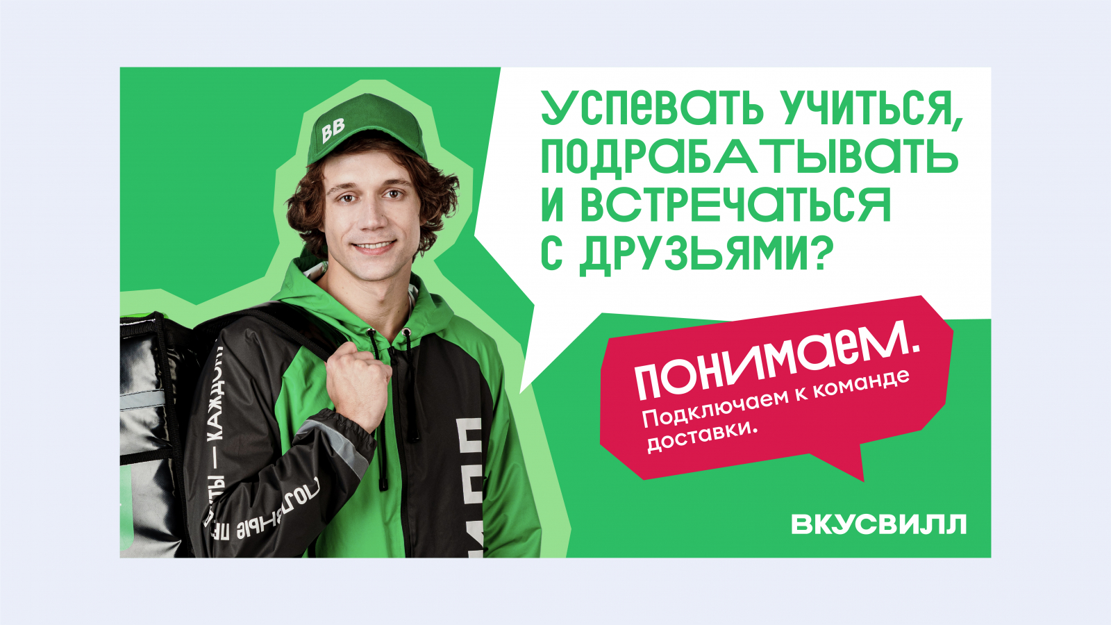 Мы обратились к будущим курьерам и сотрудникам магазинов и дарксторов так, чтобы они видели, что «ВкусВилл» — работодатель, который понимает, как важно успевать забрать ребенка из детского сада или найти подработку, которую удобно совмещать с учебой в университете.