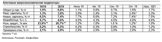 Рост ВВП составил 1,7% за третий квартал, в итоге ВВП вырос на 1,1%. Дополнительным признаком завершения периода слабого роста является недавнее подтверждение Росстатом сильного ускорения экономического роста с 0,7% в первом квартале до 1,7% в третьем. Хотя эта цифра оказалась немного ниже оценки роста правительства, но все еще очень позитивный результат. Учитывая более сильный в сравнении с ожиданиями рост оборота розничной торговли за октябрь и сильный рост зарплат, ожидается, что потребление продолжит быть главным драйвером роста в четвёртом квартале.
