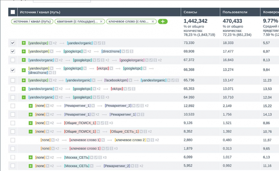 Анализировать такие цепочки надо целиком и практически вручную, сравнивая их с другими цепочками, где какие-то каналы отсутствовали. В приведенном ниже примере видно, что часть цепочек, закончившихся органическим поиском или прямым заходом в адресной строке браузера, на самом деле начались рекламными сообщениями. То есть покупку в данном случае фактически необходимо присваивать рекламному каналу.