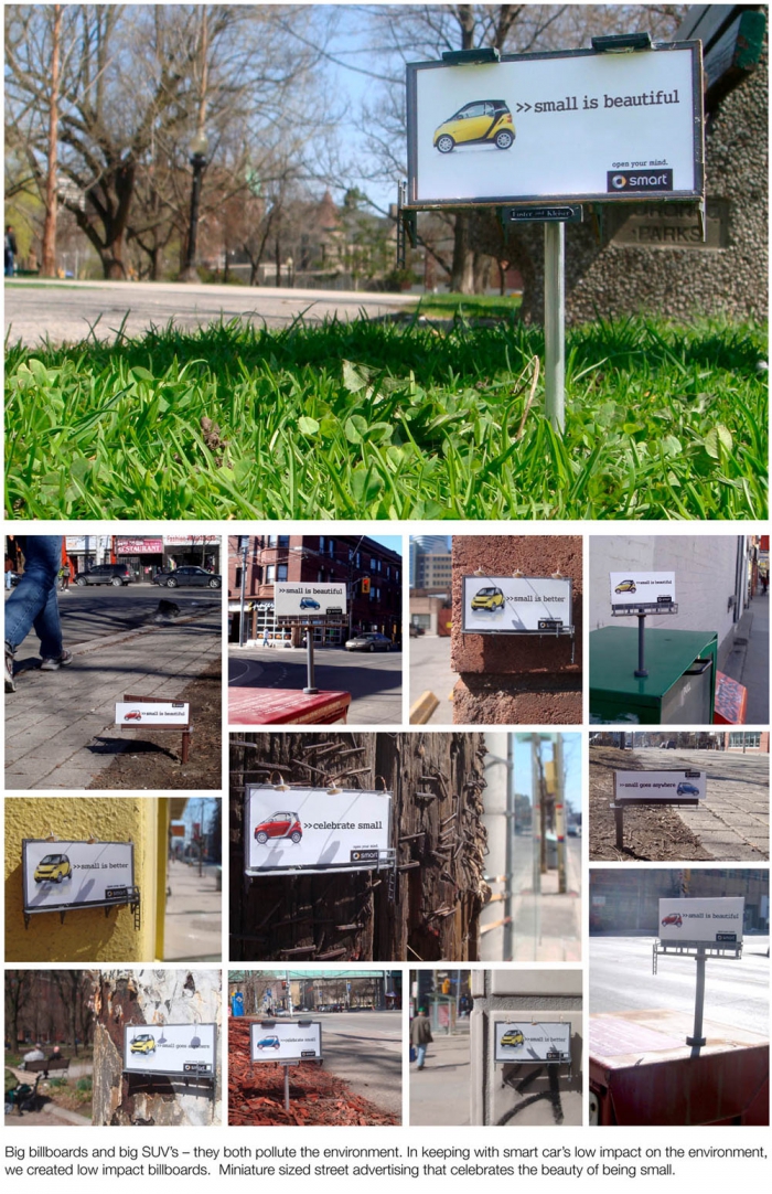 Одним из лучших примеров крошечного креатива интернет-пользователи называют кампанию бренда Smart. В 2011 году марка компактных автомобилей с помощью команды BBDO Toronto элегантно заткнула более крупных конкурентов за пояс, разместив мини-щиты на территории Канады.