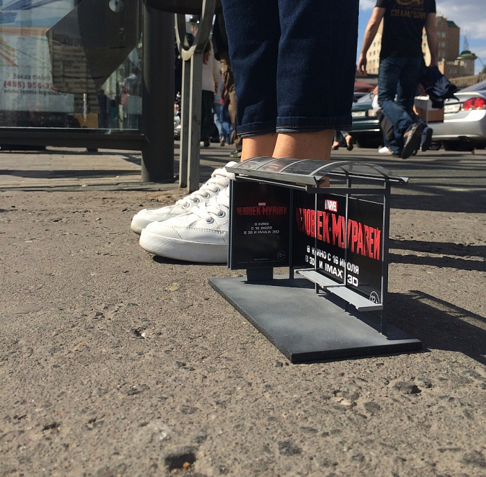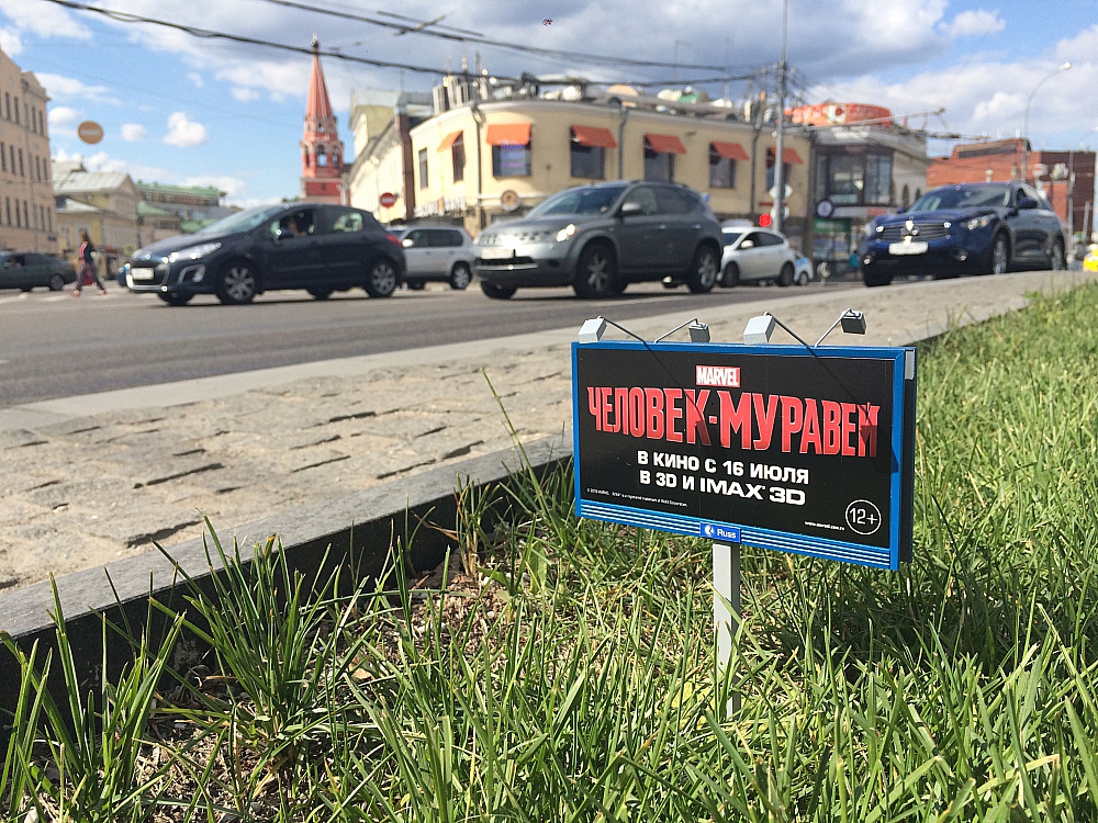 Кстати, россияне тоже могли полюбоваться малюсенькой рекламой, посвящённой выходу фильма. По всей Москве были установлены русскоязычные микро-щиты, анонсирующие дату премьеры проекта «Человек-муравей». За размещение необычного формата в столице отвечал оператор Russ Outdoor.
