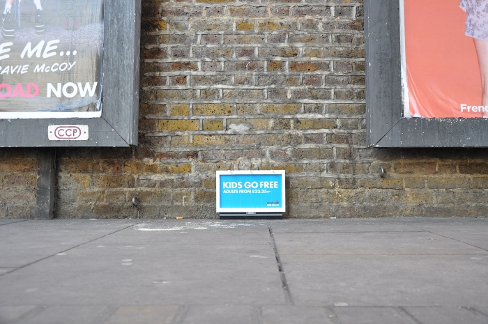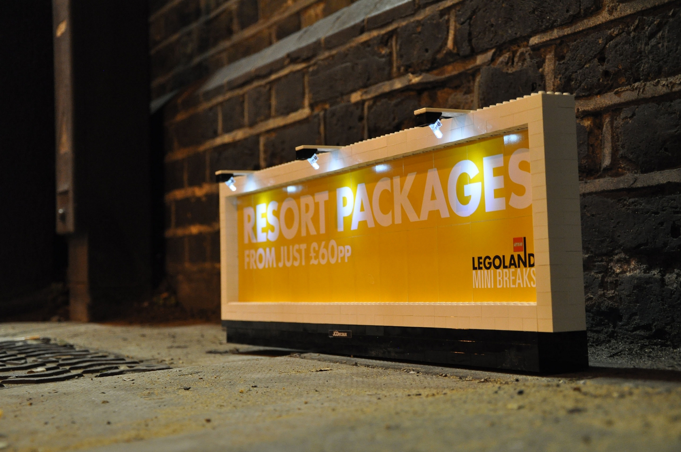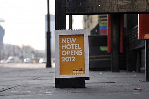 На нескольких 30-сантиметровых щитах Lego рекламировали новый отель и другие достопримечательности тематического парка. Главная особенность кампании заключалась в том, что плакаты размещались достаточно низко, так, чтобы их могли увидеть дети. Разумеется, маленькие билборды были изготовлены из фирменного конструктора Lego, и очень скоро стали хитом в Twitter.