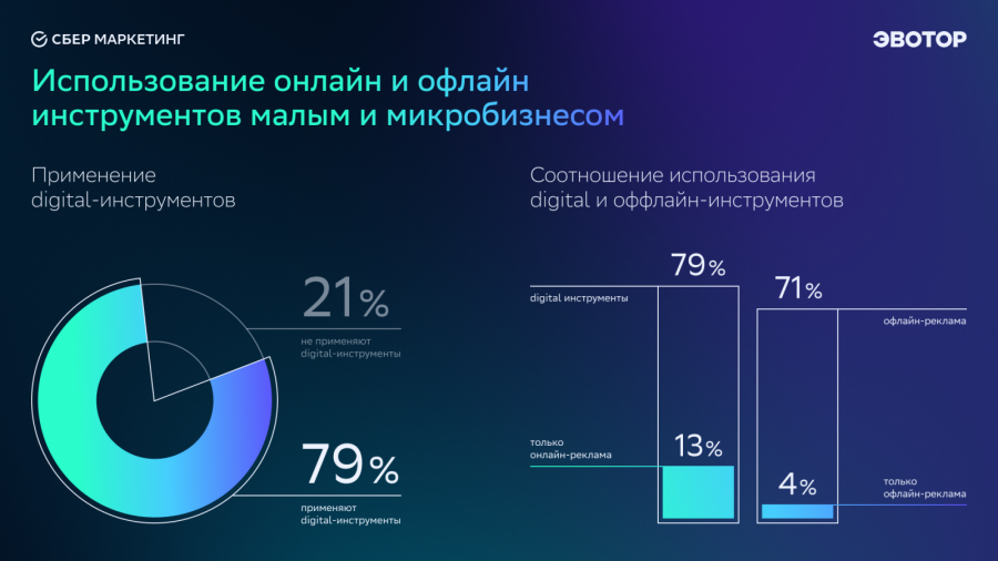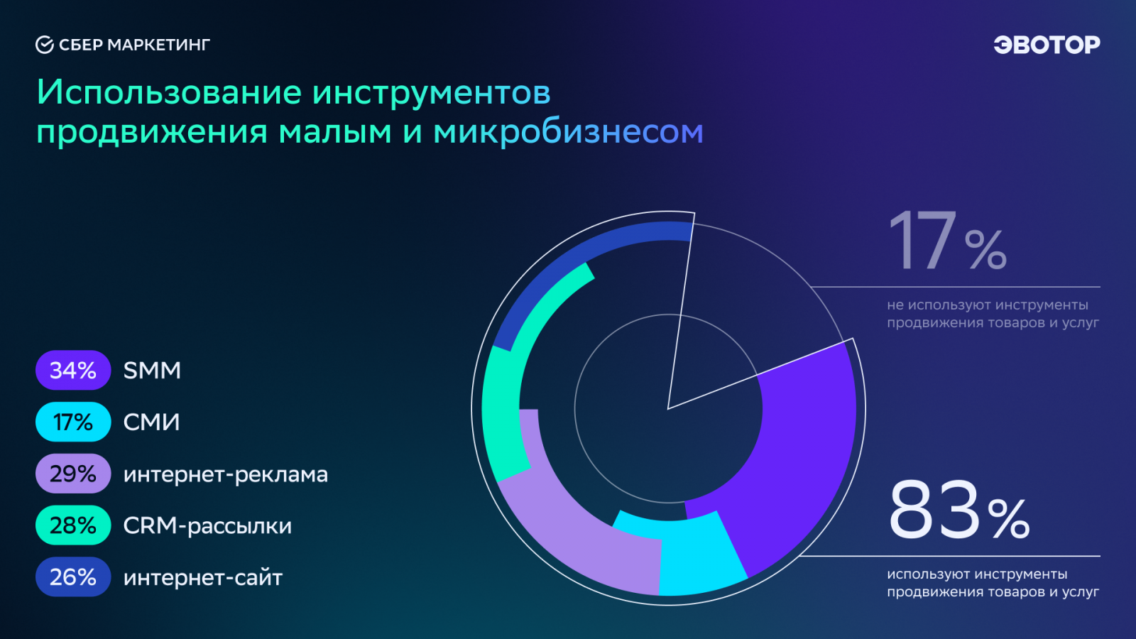 Большинство владельцев малого и микробизнеса (83%) в России используют инструменты продвижения своих продуктов и услуг. 72% опрошенных собирают базу клиентов, 57% самостоятельно занимаются рекламой и маркетингом. Таковы данные исследования «СберМаркетинга» и «Эвотора», которое есть в распоряжении Sostav.