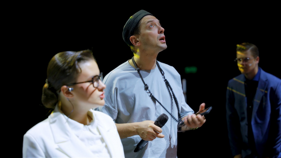 MANGO OFFICE — ИТ-компания с экосистемой цифровых продуктов. Оформление постановки с помощью мультимедийных декораций помогло отразить на сцене суть и атрибуты бренда. В данной концепции основным сценическим элементом стала передвижная серая стена-трансформер. Проектор выводил на стену различные сцены, пейзажи и фоны — это создавало уникальную атмосферу для каждой сцены проекта.