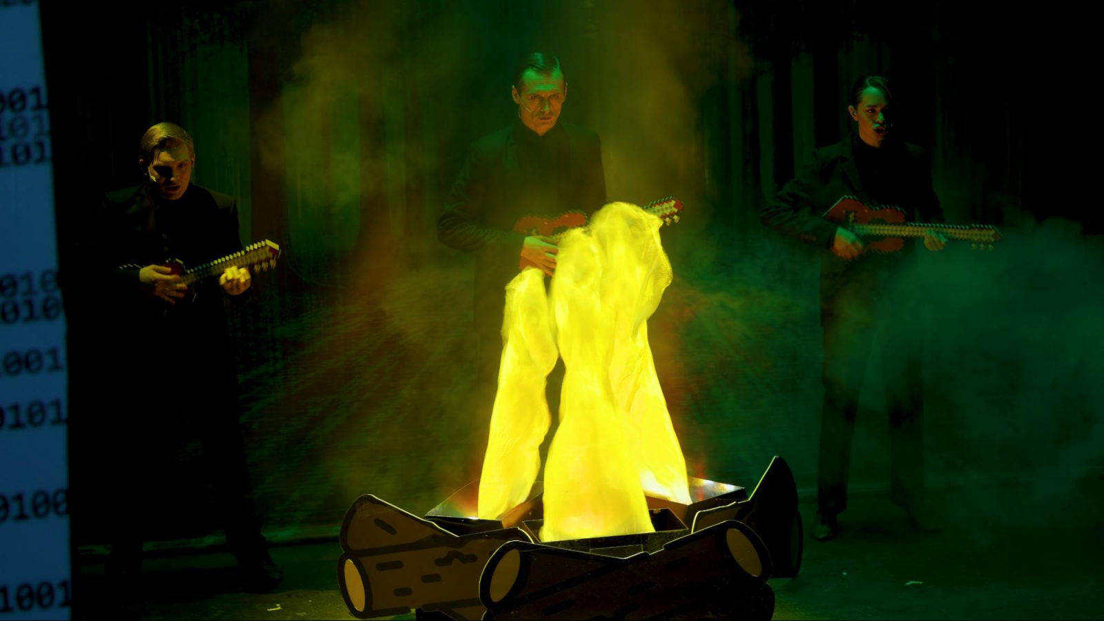 Также режиссерско-постановочная группа добавила в декорации физические объекты, которые придали глубину каждой сцене HR-оперы: мотоцикл с коляской, деревья, костер, двери дворца. Все эти элементы были не отрисованы в мультимедиа, а построены в реальности.