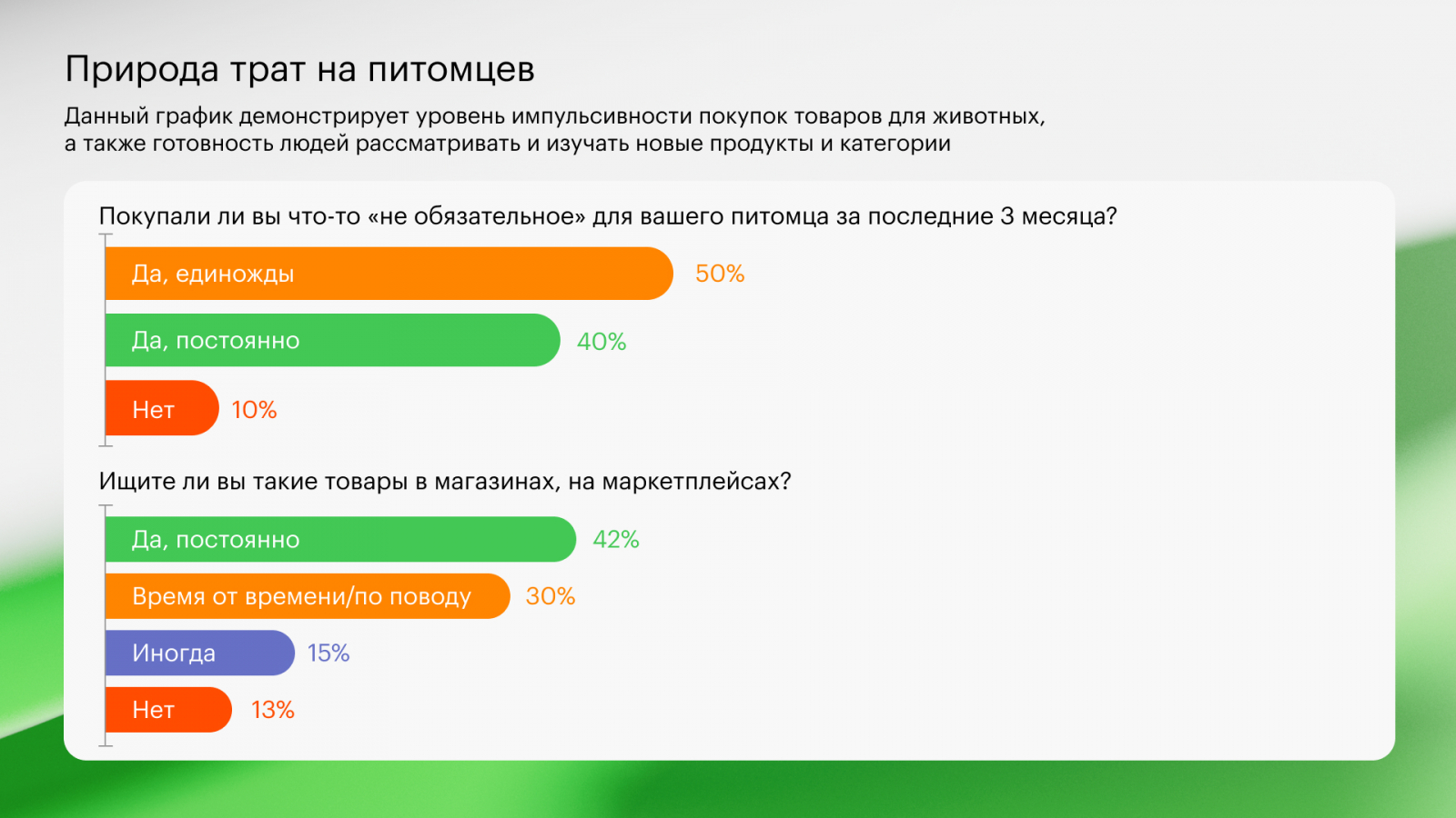 Отношение к тратам для питомцев напоминает по психологии поведение людей при рождении ребенка и характеризуется большим количеством покупок: домики, игрушки, одежда, корм, устройства и др. Это все является драйвером развития рынка и динамики в отдельных категориях.