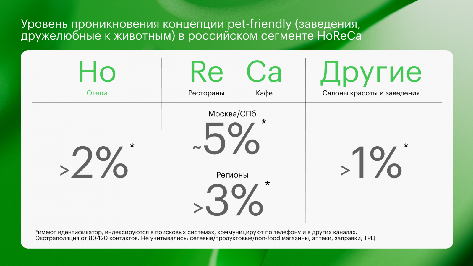 В HoReCa и смежных сервисах для питомцев заметен разрыв между ожиданиями и текущим уровнем качества. В специализированной HoReCa (груминг-салоны, ветклиники и др.) аудитория среднего класса озвучивает неудовлетворенность качеством услуг и продуктов в диапазоне 30−50%, а в случае с отелями для животных этот уровень недовольства и тревожности присутствует у более чем 80% аудитории, которые еще даже не пользовались данными услугами.