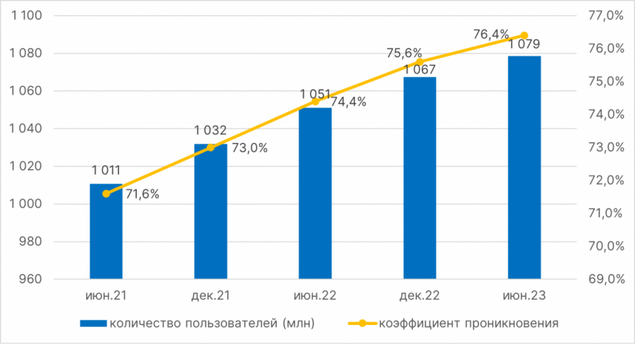 Диджитализация — это один из наиболее актуальных трендов для экономики и общества КНР. По данным из «52-го отчёта о развитии интернета в Китае» от CNNIC, в середине 2023 года число интернет-пользователей в Китае составило около 1,08 млрд человек, при этом коэффициент проникновения интернета вырос до 76,4%.