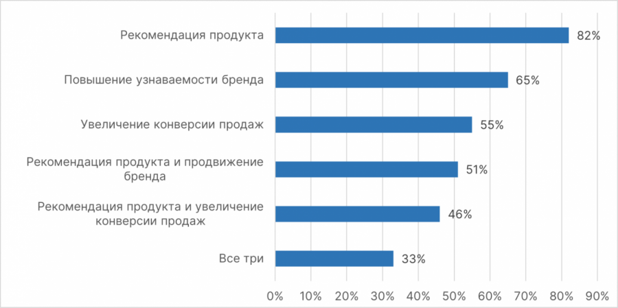 Наиболее крупные платформы по числу пользователей, привлекаемых деятельностью KOL, включают в себя Wechat, Douyin, Weibo, Kuaishou, Bilibil и Xiaohongshu. Что касается целей брендов, которые работают с KOL, наиболее популярной задачей для эффективной кампании с привлечением инфлюенсеров служит, прежде всего, рекомендация продукта.
