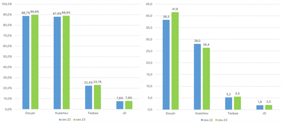 По данным iResearch, в то время как большая часть активных пользователей Douyin и Kuaishou смотрят живые стримы на этих площадках (89,8% и 88,8% пользователей в сентябре 2023 года), то пользователи ведущих маркетплейсов, таких как Taobao и JD смотрят прямые трансляции в указанных приложениях лишь в ограниченном количестве (23,1% и 7,9% пользователей в сентябре 2023 года). С другой стороны, в среднем пользователи Douyin и Kuaishou проводят за прямыми трансляциями 41,6 и 26,4 часов в месяц, что намного больше, чем пользователи Taobao и JD.