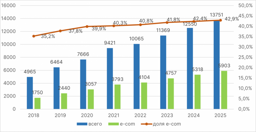 Активное вовлечение потребителей из КНР в цифровую экономику обозначило тенденцию роста китайского рынка e-commerce, который сегодня выступает крупнейшим в мире, потеснив даже развитый потребительский рынок в США. По информации CNNIC, в 2023 году онлайн-платежи (Alipay, WeChat Pay) и онлайн-шопинг вошли в топ-5 ведущих интернет-активностей в Китае на основе числа пользователей — 943 и 884 млн человек соответственно были вовлечены в эти форматы в 2023 году.