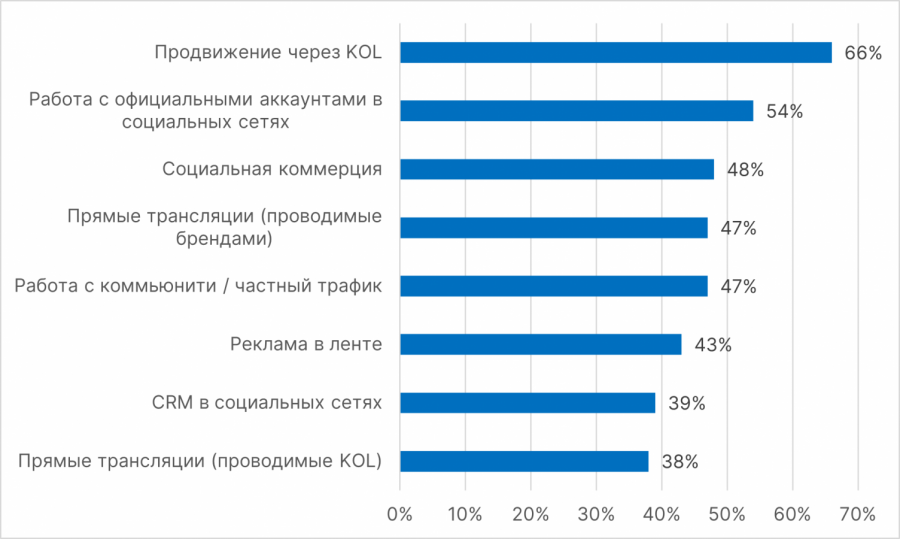 Что касается социального маркетинга, то по результатам опроса, проведённого Miaozhen Systems и China Advertising Association, наиболее популярными форматами выступили: работа с KOL , ведение аккаунтов в соцсетях, социальная коммерция, а также форматы, которые были отмечены выше — лайвстримы и работа с частным трафиком.