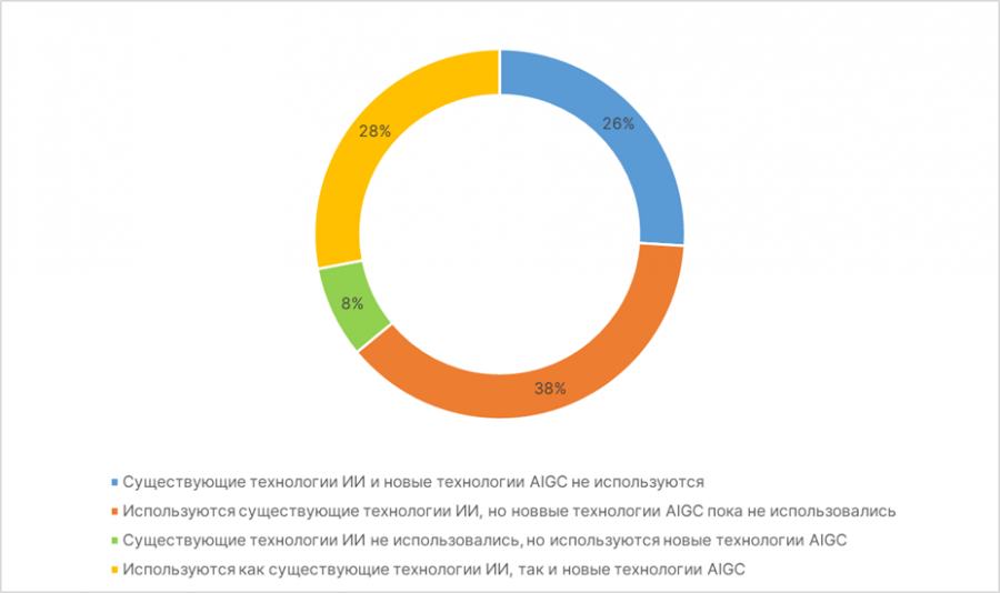Как отмечается в отчете CTR «Обзор тенденций маркетинга и рекламы в Китае 2023», в маркетинговых кампаниях в КНР в целом активно используются как старые, так и новые технологии ИИ, что отметило 74% респондентов. При этом 36% уже используют AIGC в своей маркетинговой деятельности, рассматривая эти технологии как серьёзное подспорье в вопросе повышения эффективности производства контента, создания креативного дизайна и анализа данных.