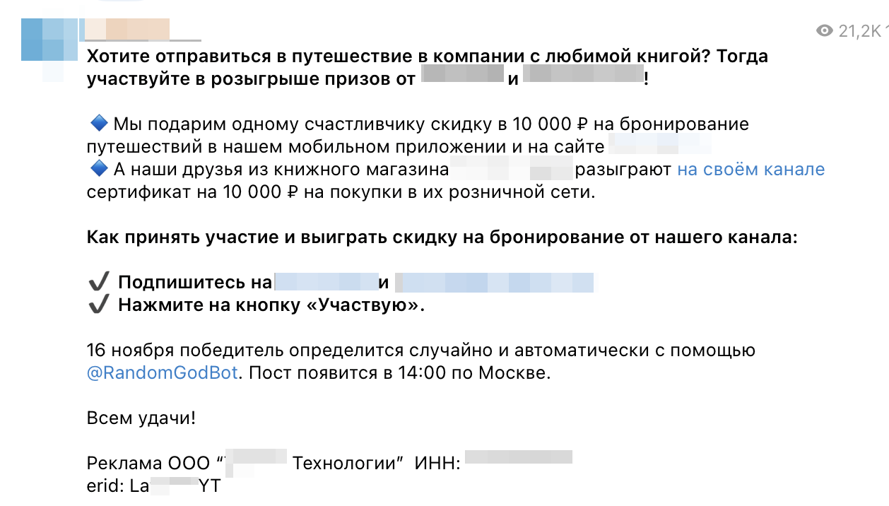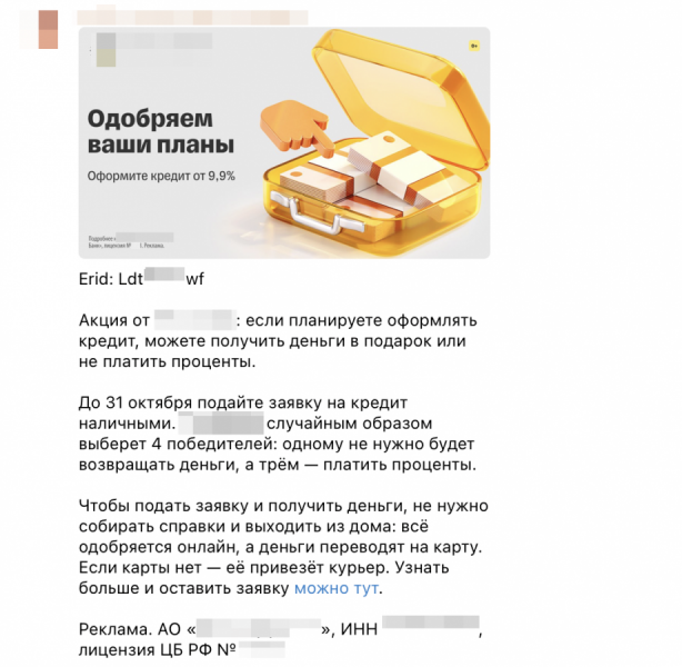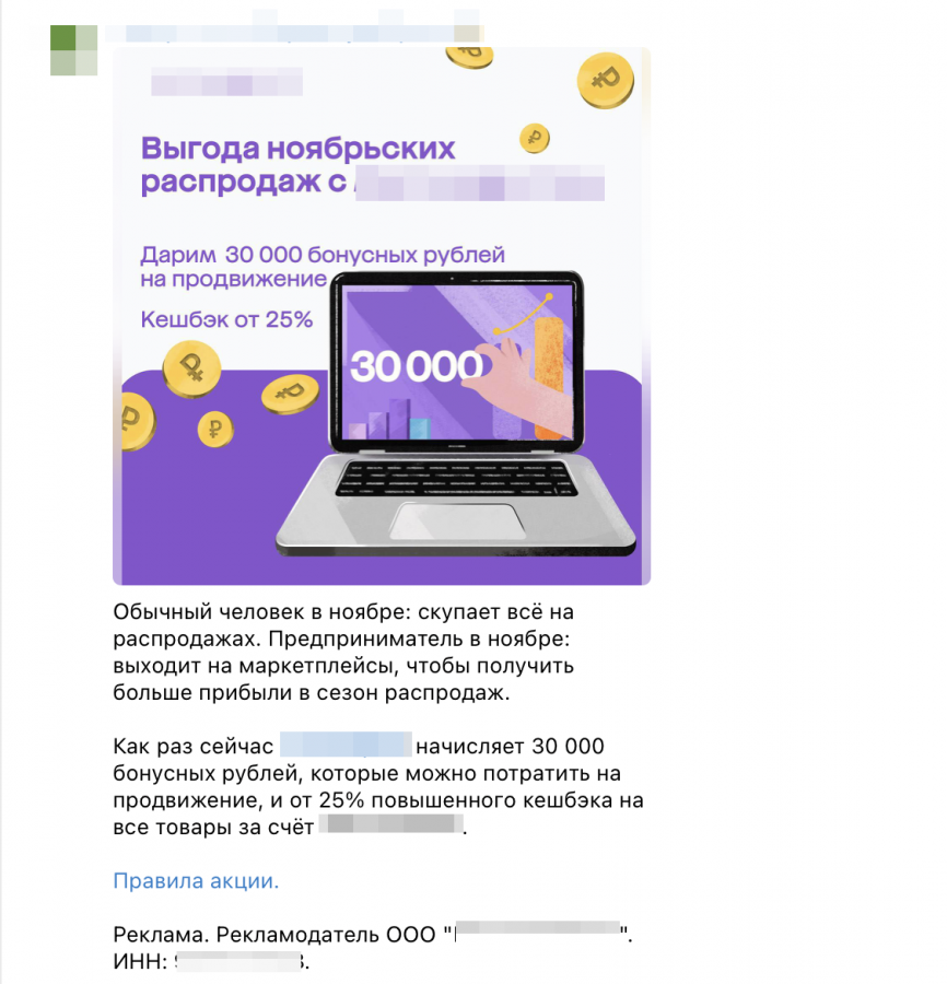 В начале текстового блока мы указывали erid, в конце — пометку «Реклама» и сведения о рекламодателе. Выглядело это как в данном примере: