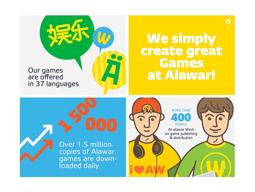 Специалисты студии разработали традиционный элемент знака Alawar — буква «W», которая превратилась в пружину от пусковой машины развлечений. В целом же бренд издателя казуальных игр предстал в виде знаменитой машины Руба Голдберга, которая представляет собой сложное и запутанное устройство, выполняющие очень простые функции.