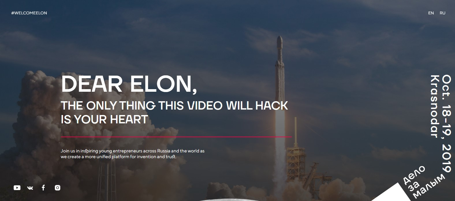 Идея обратиться к Илону Маску прозвучала как шутка на одной из стратегических сессий по организации форума для предпринимателей «Дело за малым!». Однако мы отнеслись к предложению серьёзно и начали искать оригинальный способ пригласить Илона в Россию.