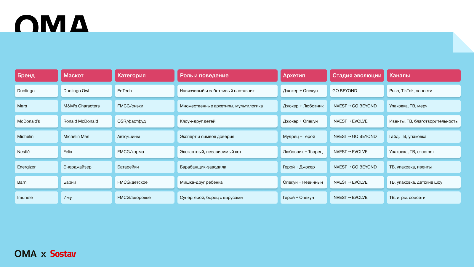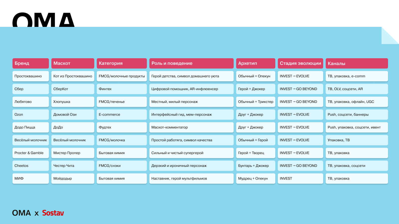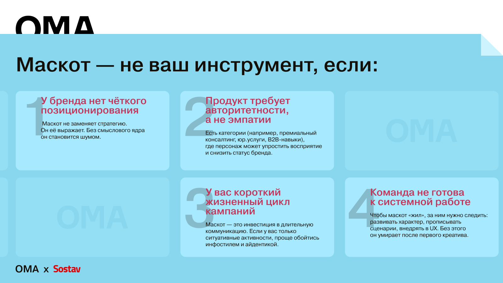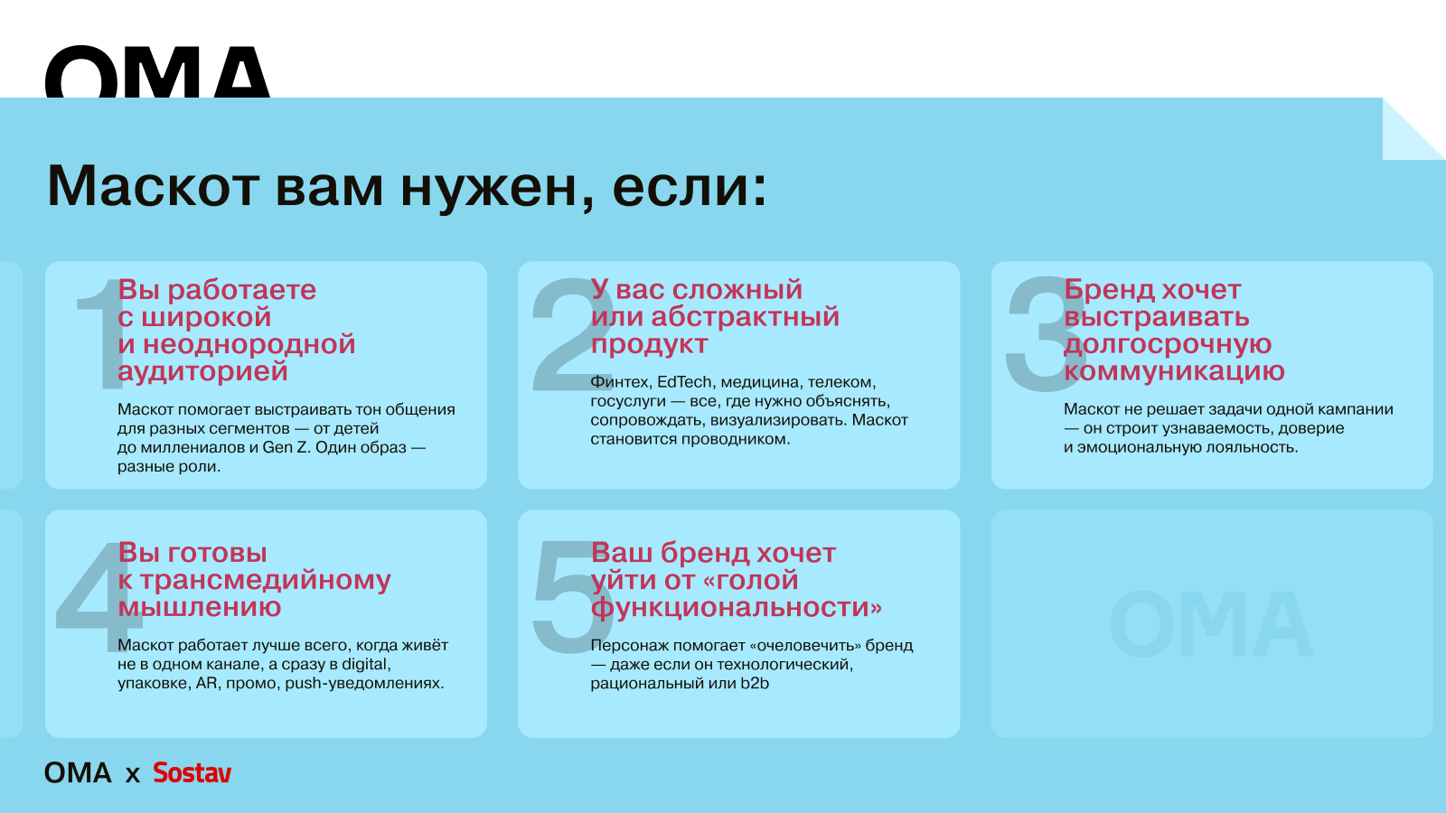 По результатам анализа OMA можно утверждать: маскот работает, только если с ним работают. Эффективные персонажи — это не «удачные картинки», а результат стратегической инженерии. У них есть цель, роль, поведение и развитие. Они встроены в каналы, подчинены архитектуре бренда и двигаются по логике маркетинга, а не по принципу «давайте сделаем что-то веселое».