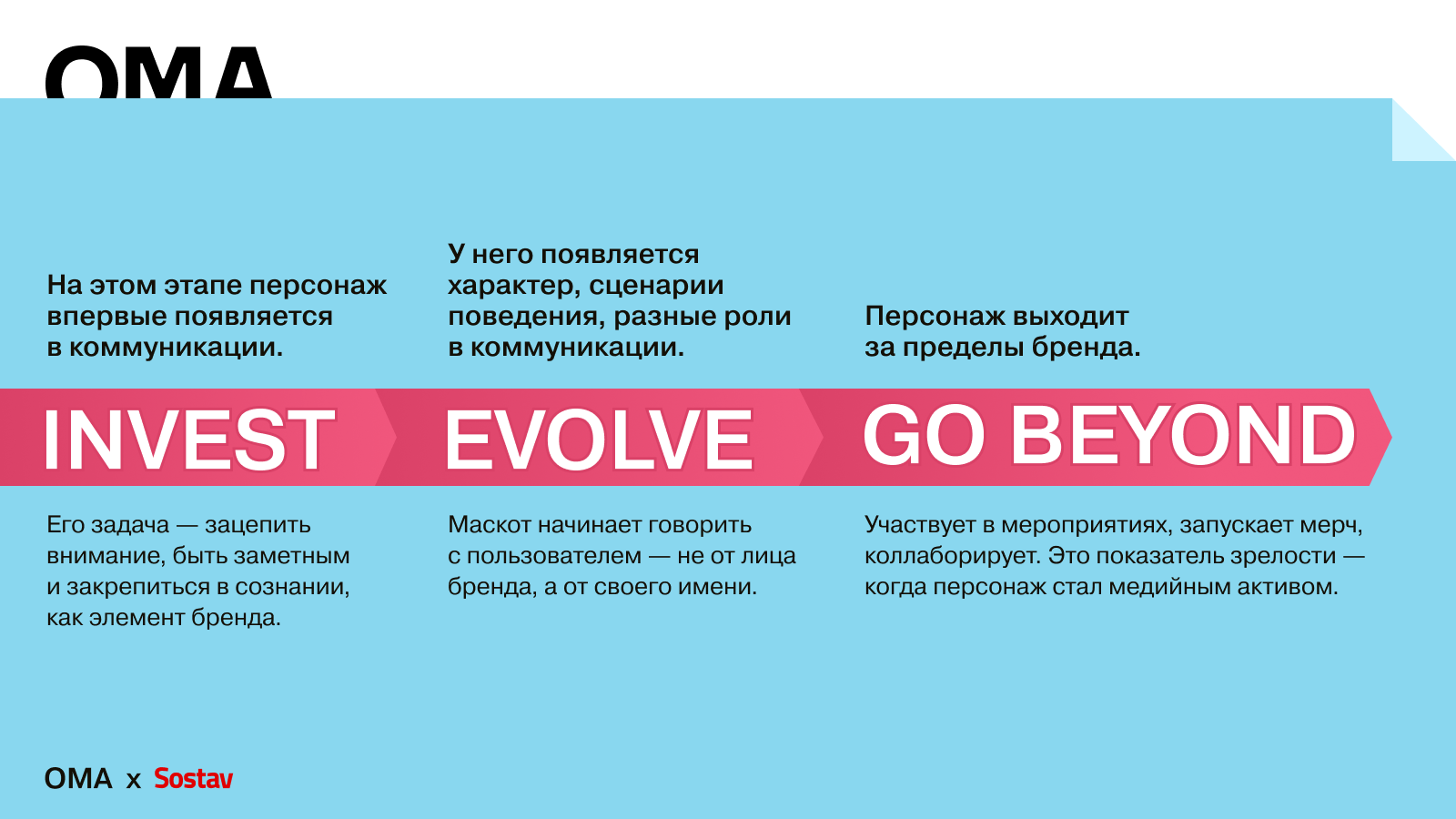 Анализ агентства OMA показал: в большинстве успешных кейсов маскот проходит три стадии развития. Это позволяет использовать его потенциал на каждом этапе коммуникационного цикла — от первого касания до лояльности и повторного вовлечения.