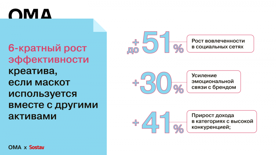 По данным исследования Ipsos и JKR, маскот входит в топ-3 бренд-активов, напрямую влияющих на эффективность рекламы. Он уступает только продукту и логотипу. При этом маскот значительно опережает слоган, цветовую гамму и даже упоминания бренда в кадре по таким метрикам, как запоминаемость и эмоциональное вовлечение.