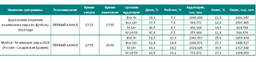 Трансляция церемонии открытия Чемпионата и матча стала самой популярной передачей на российском ТВ, собрав больше половины зрителей в Москве, включивших телевизор (52,6%, доля программы). В течение хотя бы одной минуты за ходом матча, в котором сборная России разгромила сборную Саудовской Аравии, наблюдали примерно 3,66 млн человек.