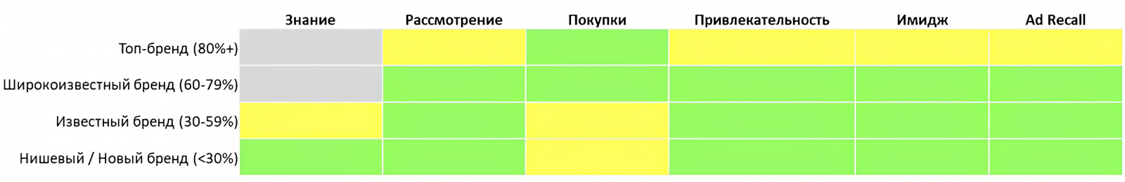 На базе BLS-замеров, проведенных в канале университеты за 2021−2023 обнаружена закономерность вероятности получения приростов в тестовой группе (в сравнении с контрольной). По статистике, в страте «топ-брендов» (знание выше 80%) систематически наблюдается увеличение процента покупателей в тестовой группе. Показатели «рассмотрение», «привлекательность», «имидж», «ad recall» в большей степени значимо прирастают в страте широкоизвестных брендов — 60−79% знания на рынке.