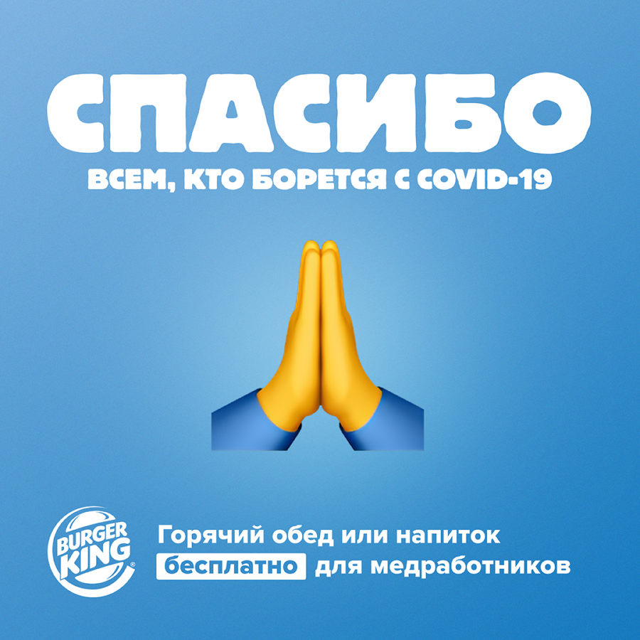 Burger King предложит любому медработнику получить в работающих навынос и в формате «автораздача» по желанию либо бургер с напитком, либо горячий напиток бесплатно, рассказали Sostav в пресс-службе компании.