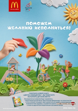 McDonald’s ставит перед собой задачу помочь детям с ограниченными возможностями свободно чувствовать себя в современном обществе и осуществлять свои мечты. В рамках проекта «Поможем желанию исполниться» в Сочи будет строиться детская площадка, на которой смогут играть как здоровые дети, так и дети с тяжелыми заболеваниями. Каждый желающий имеет возможность помочь детям, покупая с 1 по 30 ноября книгу и наклейку «Цветик-семицветик».