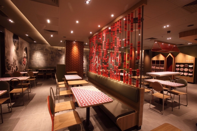 Интерьер ресторана выполнен в традиционных для McDonald's красных, желтых, серых и черных цветах, с добавлением элементов и предметов декора, свойственных китайской культуре, к примеру, висячие светильники, бамбуковые ширмы и т.д.
