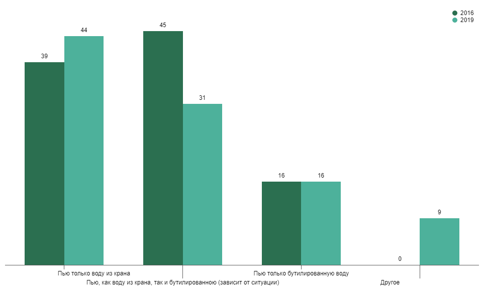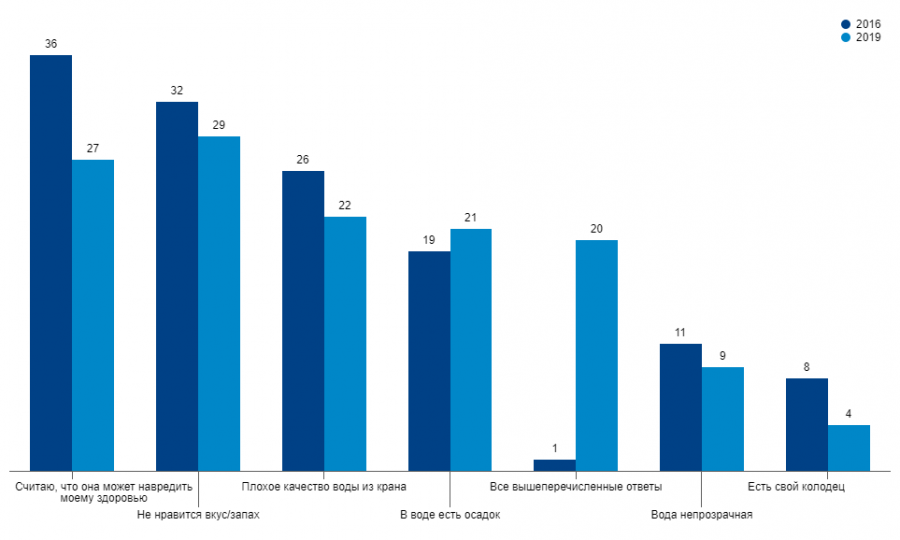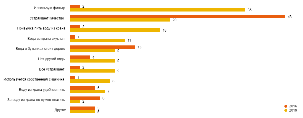 Главная причина начать употреблять воду из городской сети водоснабжения — это покупка фильтра, сообщили 35% респондентов. Те, кто избегают воды из-под крана в любом виде, чаще всего называют причиной потенциальный вред для здоровья. Сегодня в этом уверены 27%, а три года назад за свое самочувствие опасались 36% опрошенных. Есть те, кому не нравятся вкус и запах воды (29%), они считают ее недостаточно чистой (22%) или говорят о наличии осадка (21%).