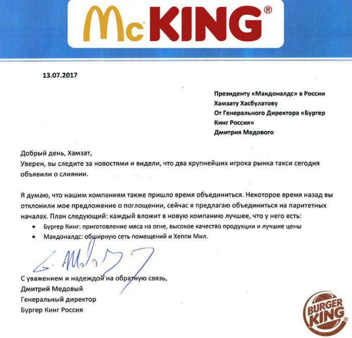 Российское подразделение Burger King опубликовало в соцсетях предложение к McDonald's объединиться в новый сервис McKing, взяв из обеих компаний самое лучшее.