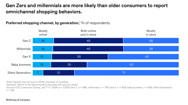 Поколения Z и миллениалы выросли в цифровой среде — с онлайн-поиском, социальными продажами, мобильными платежами и алгоритмическими рекомендациями. Это сформировало их привычку сочетать онлайн- и офлайн-покупки. Именно представители этих поколений значительно чаще используют гибридный подход — они одновременно покупают и в интернете, и в физических магазинах. В то же время бэби-бумеры в основном предпочитают традиционный офлайн-шопинг.