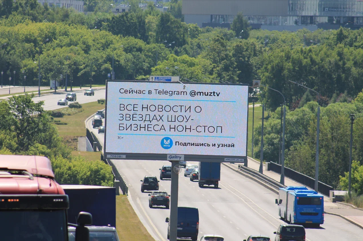 На 626 цифровых билбордах в 18 городах страны в режиме реального времени начали появляться «тизеры» новостей о звездах российского и мирового шоу-бизнеса — текст на экране выглядел как сообщение из мессенджера со спойлером и появлялся практически одновременно с выходом новости в Telegram-канале. Полную новость человек мог узнать только в Telegram-канале Муз-ТВ.