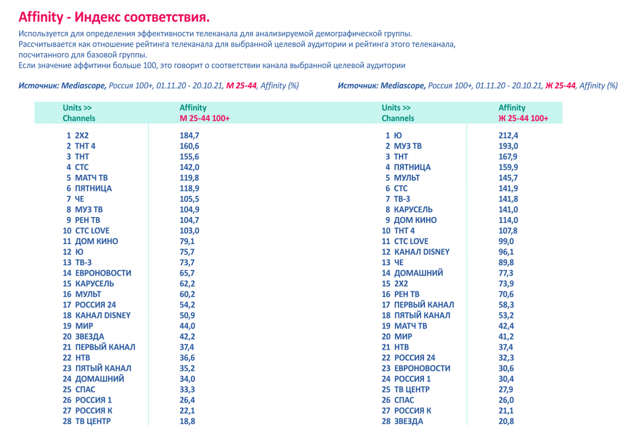 Если обратиться к данным по аффинити телеканалов по наиболее востребованным у рекламодателей целевым аудиториям, можно увидеть, что в аудитории молодых мужчин три верхние строчки занимают каналы холдинга «Газпром-медиа» — «2×2», ТНТ 4 и ТНТ.