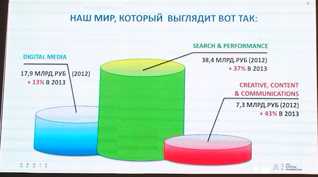 На конференции телеканал ТНТ то ли с сарказмом, то ли со стыдом сетовал, что полноценно не присутствовал в digital вплоть до 2013 года и вдруг опомнился, и сейчас меры по развитию дистрибуции легального видеоконтента в Сети принесли 40 млн просмотров видео в месяц. Однако узнаваемые бренды ТНТ вроде ComedyClub, «Интерны» и «Реальные пацаны» вряд ли можно противопоставить триумфу в интернете неизвестному никому ранее +100500 (Caramba TV).