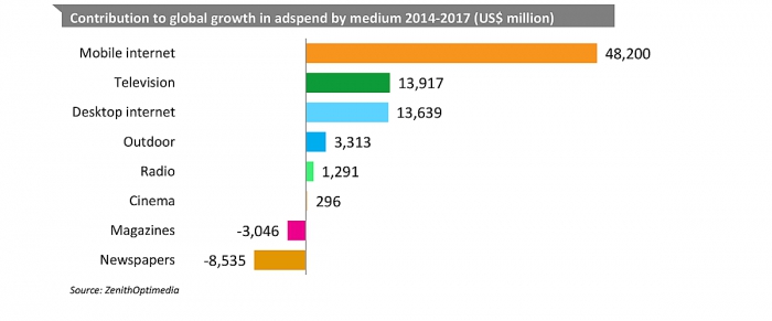 Его слова подтверждают данные ZenithOptimedia о глобальном медиапотреблении. По оценкам агентства, в 2014–2017 годах доля ТВ снизится на 2,3 п.п. газет — на 3,2 п.п., журналов — на 1,5 п.п. Внимание потребителей переключится на мобильный интернет, чья доля вырастет с 5,1% до 12,9%.