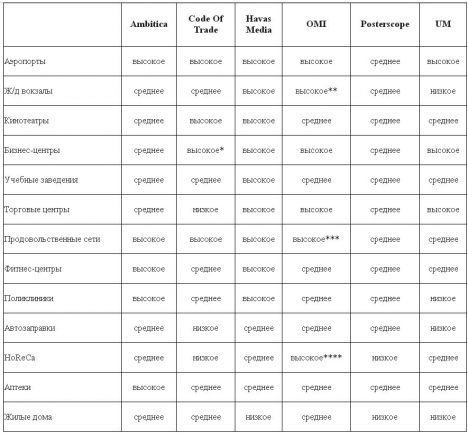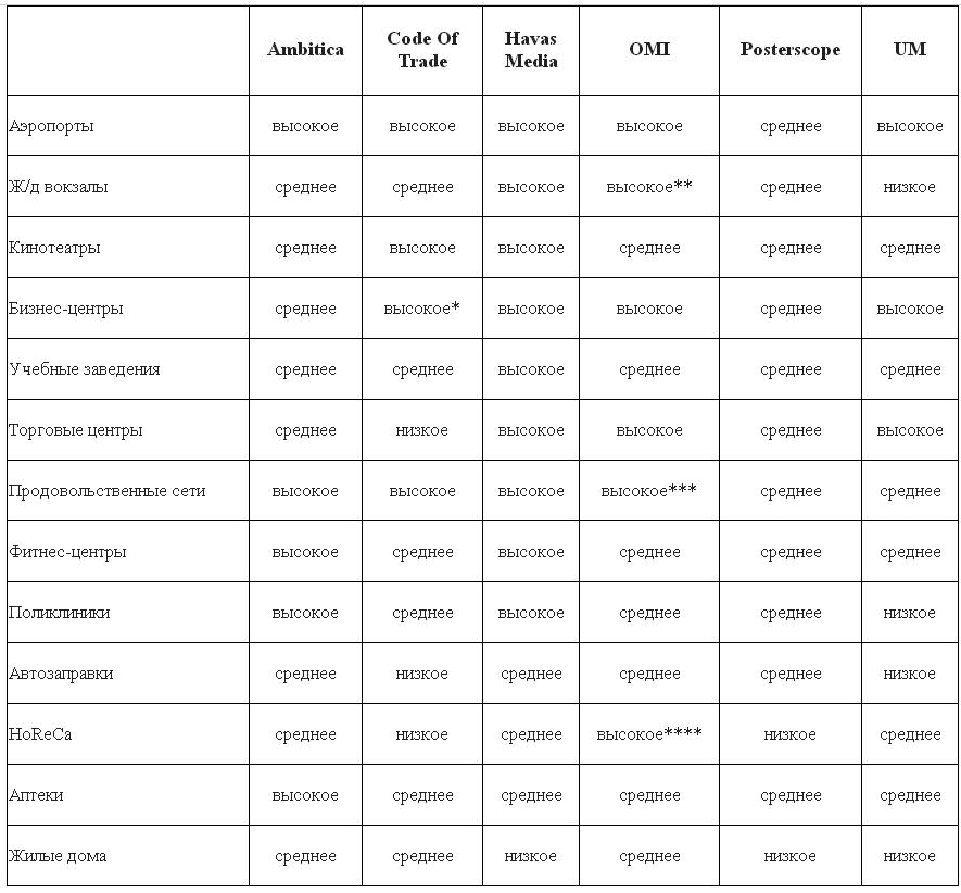 Практически все эксперты выделили следующие indoor-площадки: аэропорты, торговые и бизнес центры, in-store (розничные магазины), учебные заведения, кинотеатры, в меньшей степени — лечебно-поликлинические учреждения. Примечательно, что закупщики выделили даже такие indoor-каналы, как рынки и арт-площадки. Оценка покрытия, которое предоставляют indoor-операторы: низкое/среднее/высокое (по площадкам indoor).: