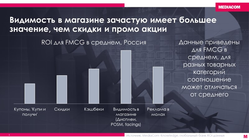 И ритейлеры, и шопинг-моллы как никогда открыты к экспериментам и внедрению новых технологий, которые помогут им привлечь трафик в магазины, а производителю — подвести покупателя к покупке нужного бренда. Например, действия по повышению заметности бренда в магазине имеют ROI х2 по сравнению со скидками, и их разнообразие с развитием технологий становится все шире: например, появляются инструменты управления движением покупателя в магазине и контакта в переломных точках маршрутов.