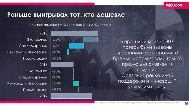 Также негативно на продажи некоторых товаров повседневного спроса влияли смещения фундаментальных социодемографических факторов, таких как изменение структуры семьи, развитие привычек здорового образа жизни, питания, ускорение темпа жизни (-6,3%). Уменьшение инвестиций в рекламу и запуск инноваций только усилили падение продаж (-0,8%). В 2014−2016 годах бренды в основном использовали промоакции как инструмент борьбы со снижением спроса (+3%).