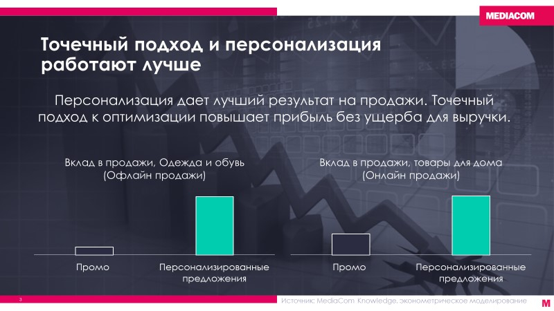 Кому-то действительно необходима скидка, чтобы стимулировать интерес к бренду, а кому-то важнее будет получить сервис доставки к определенному времени, консультацию эксперта и подписку на смежные товары на определенное время. Наш анализ персонализированных предложений показывает, что они приносят производителю гораздо большую отдачу на продажи, чем традиционное промо, вклад в продажи от них в несколько раз выше традиционного промо. При этом закономерность действует для разнообразных товарных категорий, ценовых сегментов, как для традиционного ритейла, так и для продаж в e-com. К тому же персонализация не только помогает добиться лучшего краткосрочного эффекта на продажи, но и выстраивает доверие потребителей, помогает улучшить долгосрочную устойчивость и иммунитет бренда.