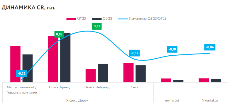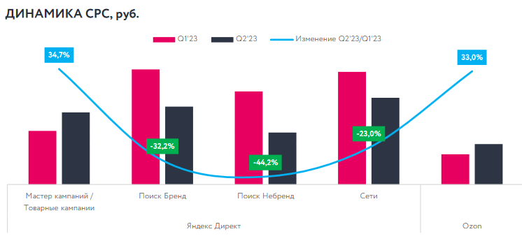 Данные факторы способствовали росту медиаинфляции — как в закупке трафика на более чем 15%, так и в стоимости конверсии — 18% относительно первого квартала. При этом квартальная инфляция первого квартала 2023 года к четвёртому 2022-ого составила 19% в стоимости конверсии при почти неизменном CPC (+0,39%).