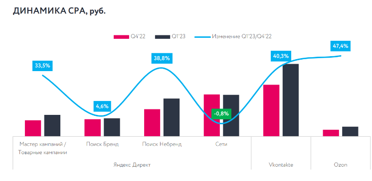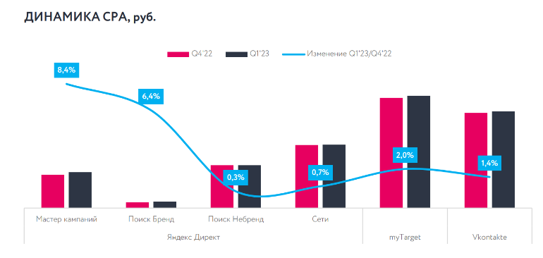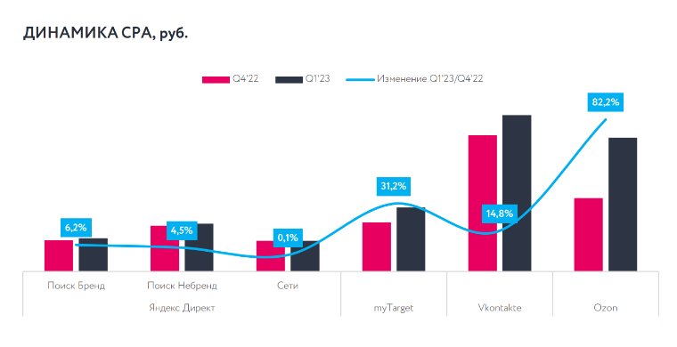 Эксперты E-Promo отмечают в начале 2023 года усиление перфоманс-тактик с меньшими медиабюджетами, что отражается на стоимости закупки трафика — средний СРС по отрасли вв первом квартале 2023 года вырос на 9,9% относительно четвёртого квартала 2022 года. При этом стоимость конверсии осталась на уровне четвертого квартала 2022 года — СРА вырос на 0,89%.