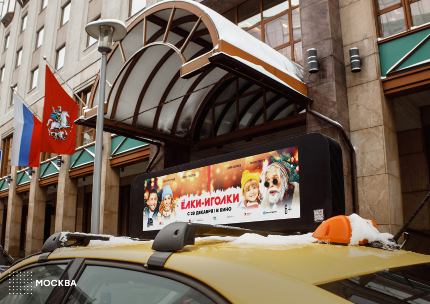 Примером ещё одной новогодней кампании на такси-экранах выступает афиша романтической комедии «Ёлки-иголки». Российская премьера фильма состоялась 29 декабря, поэтому такси-афиша «зашла на ура», рассказывает Maer. К тому же, слоган фильма «Доставка новогодних желаний» совпал с возможностями медиахолдинга: новогоднее настроение было доставлено миллионам москвичей.