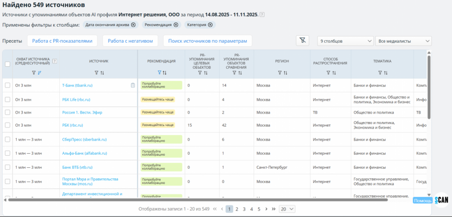 - подбирать и ранжировать СМИ по теме, региону, охвату и влиянию: