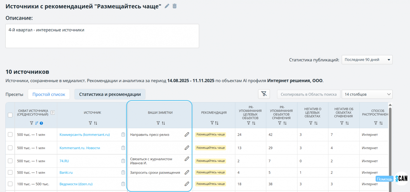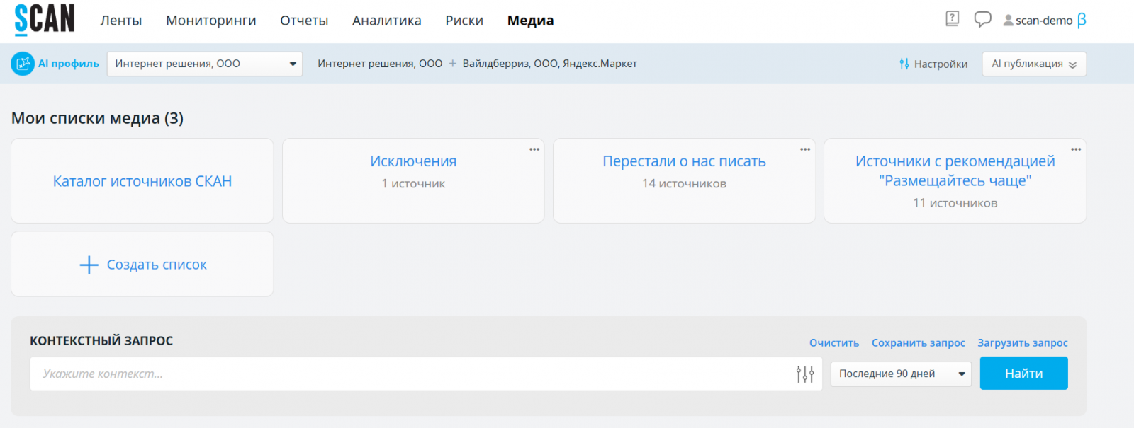 «Функционал «Медиалисты» в системе появился, как переосмысление всей работы со СМИ — не как набор разрозненных файлов, а как четкое стратегическое управление медиапространством компании», — отмечают эксперты СКАН-Интерфакс.