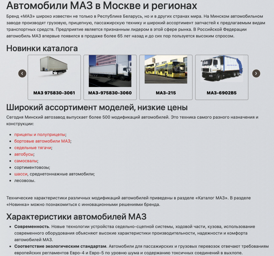 Актуальная линейка МАЗа включает более сотни автомобилей, каждый из которых было необходимо показать так, чтобы пользователь мог рассмотреть его детально. «В то же время нам важно было избежать избыточности каталога, когда ассортимент товаров на странице растягивался на десятки экранов. Кроме того, что чрезмерный объём каталога мог отпугнуть пользователя, он также замедлял работу сайта, — рассказали специалисты MediaNation. — Наша команда нашла решение, чтобы показать большое количество техники и сэкономить место. Мы использовали скрытые блоки, где переход от одного блока к другому сопровождается анимацией».