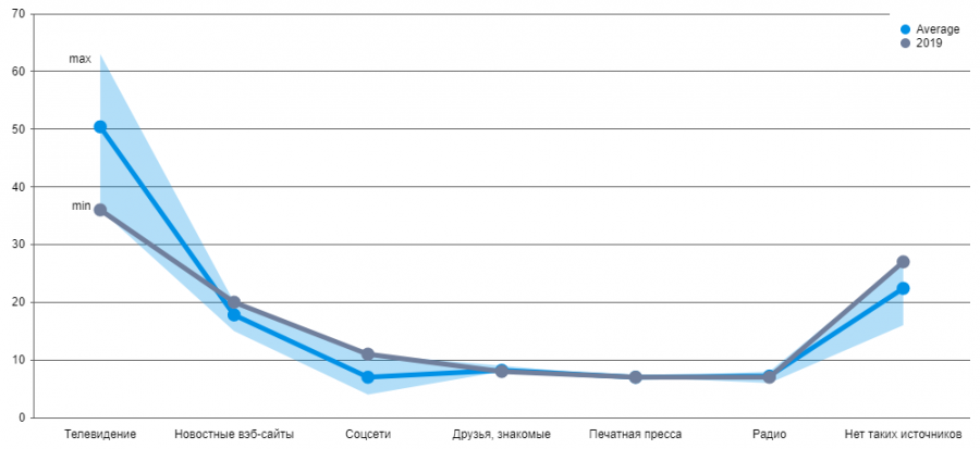 Правда, получить информацию из какого-то источника — это одно, а доверять ему — все-таки другое. И люди понимают это. Так, доля тех, кто доверяет телевидению больше, чем другим каналам, вдвое меньше, чем тех, кто именно оттуда узнает о новостях. Причем, это доля за последние годы стремительно снижается. Изменения в уровне доверия к другим информационным каналам значительно меньше за одним исключением: доля нигилистов, т.е. тех, кто не доверяет ни одному источнику, выросла с 2015 года почти вдвое и составляет в 2019 году 27%.
