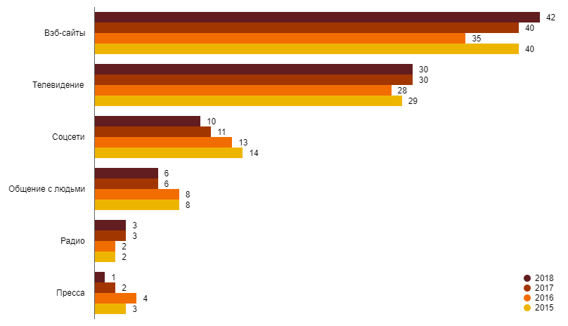 Во-первых, телевидение уступило позицию самого доверительного источника вэб-сайтам, причем, доля последних устойчиво растет последние три года.